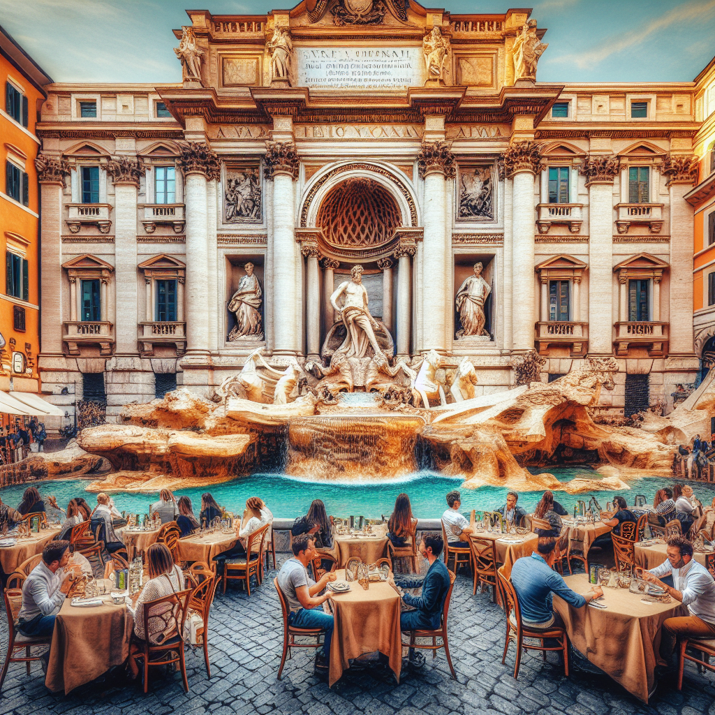 Based on my unforgettable experience traveling to Rome, the restaurant would have a large classical fountain on its facade, where patrons could toss coins and make wishes.